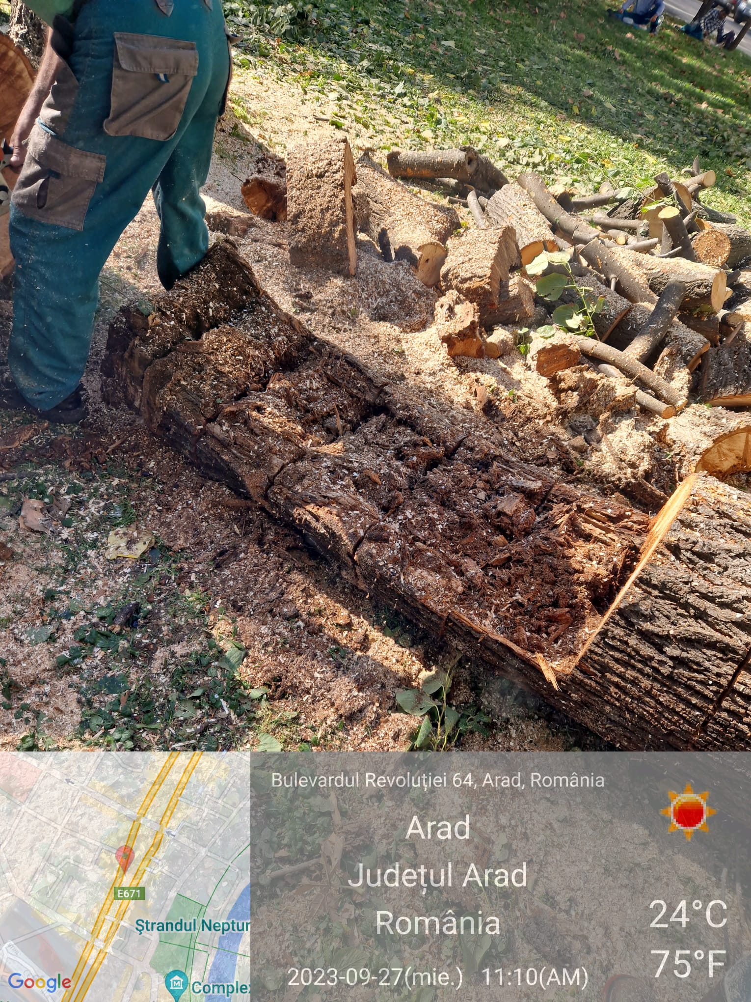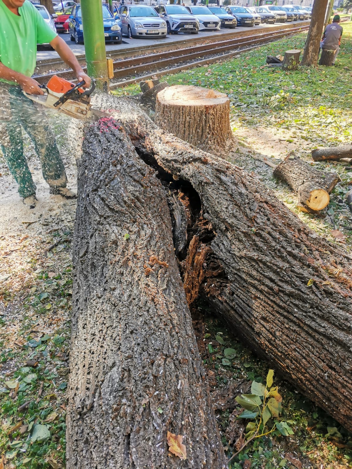 Miercuri dimineață, drujbele celor de la Gospodărirea Comunală Arad au început să „răsune” pe bulevard, în apropiere de Palatul Administrativ. „Toaletarea” a însemnat, în fapt, punerea la pământ a unui copac de mari dimensiuni. Am solicitat municipalității să ne transmită care este motivul pentru care copacul a fost tăiat în întregime. Conform reprezentanților Primăriei Municipiului Arad, copacul a fost tăiat deoarece era bolnav și prezenta risc de cădere, aceștia transmițând și o imagine în care se vede cum la mijlocul trunchiului copacul era găunos.