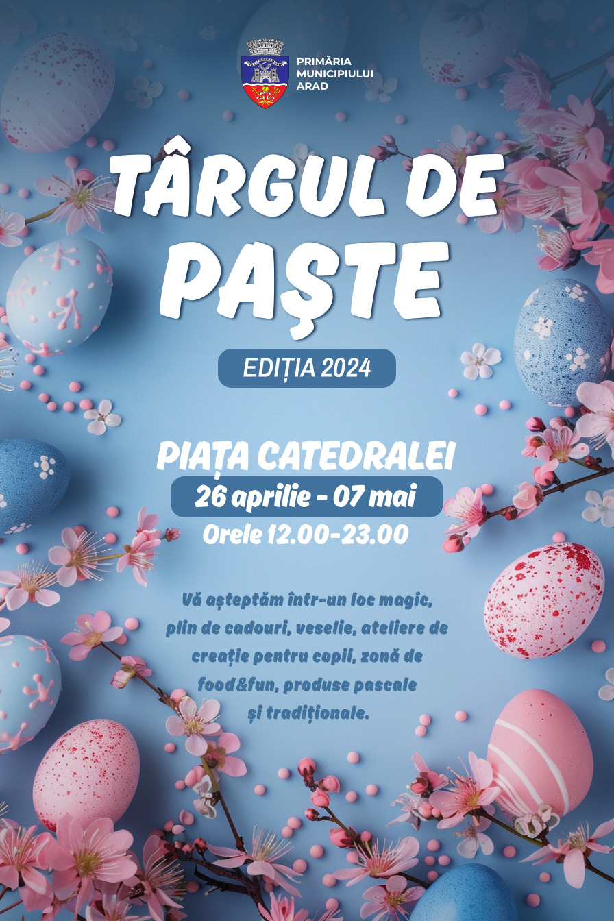 Ediția din acest an a Târgului de Paște se va desfășura în perioada 26 aprilie – 7 mai 2024 (cu posibilitate de prelungire), interval în care 40 de comercianți vor expune spre comercializare produse handmade și de artă meșteșugărească specifice sărbătorilor pascale, însă nu vor lipsi nici producătorii și comercianții de produse alimentare specifice sărbătorii. 22 de căsuțe au fost amplasate în Piața Catedralei printre decoruri tematice ce vor împodobi și platoul din fața Palatului Administrativ. Ca în fiecare an, Primăria Arad și Centrul Municipal de Cultură au amenajat o zonă special dedicată copiilor unde aceștia se vor putea juca sau vor putea participa la diferite ateliere de creație.