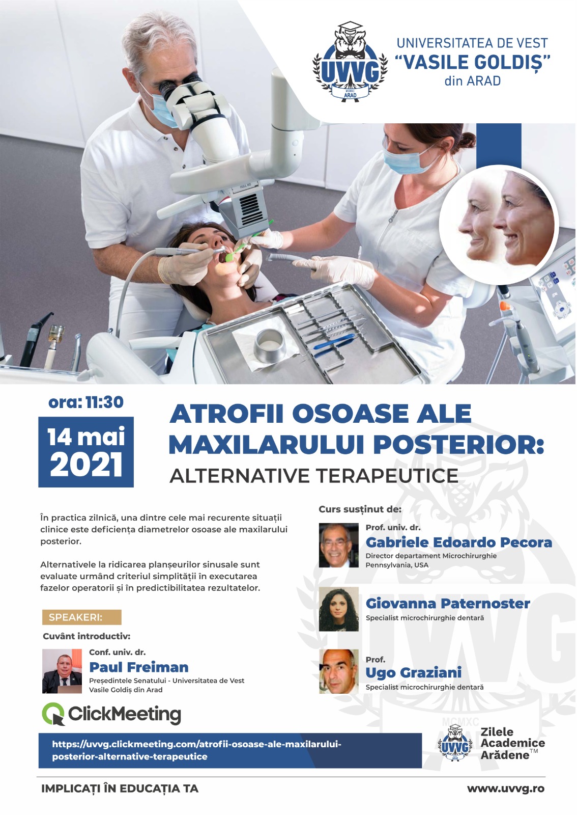 Astfel, studenţii medicinişti UVVG vor avea şansa de a afla noutăţi despre deficiența diametrelor osoase ale maxilarului posterior şi alternativele la ridicarea planseurilor sinusale, urmând criteriul simplității în executarea fazelor operatorii şi predictibilitatea rezultatelor. Evaluarea diagnosticului, susținută de tehnologii avansate și un plan de tratament adaptat realității clinice și așteptărilor pacientului, sunt elemente decisive pentru alegerile terapeutice.