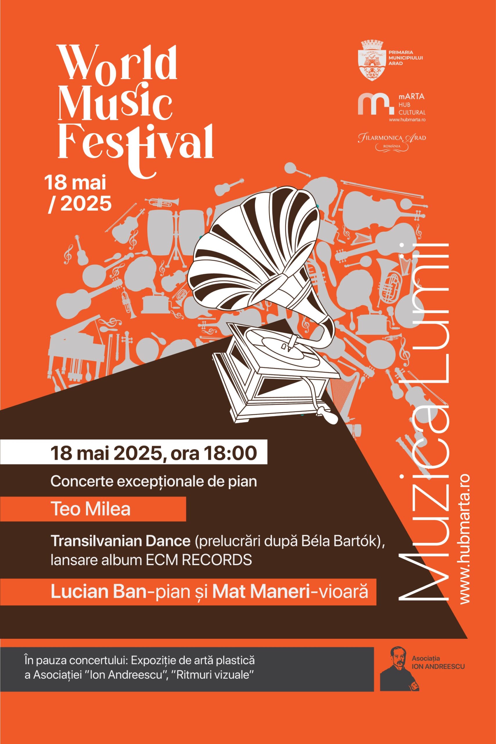 Cea de a doua etapă va avea loc pe 18 mai, de la ora 19:00, în Sala Mare a Filarmonicii Arad. Va fi o seară specială de muzică rafinată, cu invitați de excepție: Teo Milea, pianistul care cucerește scene internaționale prin sensibilitate și inovație, și un duo remarcabil din jazzul contemporan: Lucian Ban și Mat Maneri. Concertul promite o experiență sonoră profundă, între improvizație și emoție pură. Biletele sunt disponibile pe Eventbook https://eventbook.ro/music/bilete-world-music-festival-muzica-lumii și la casieria Filarmonicii Arad.