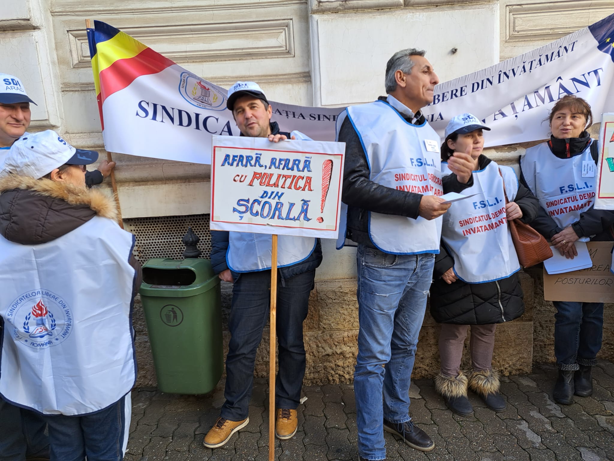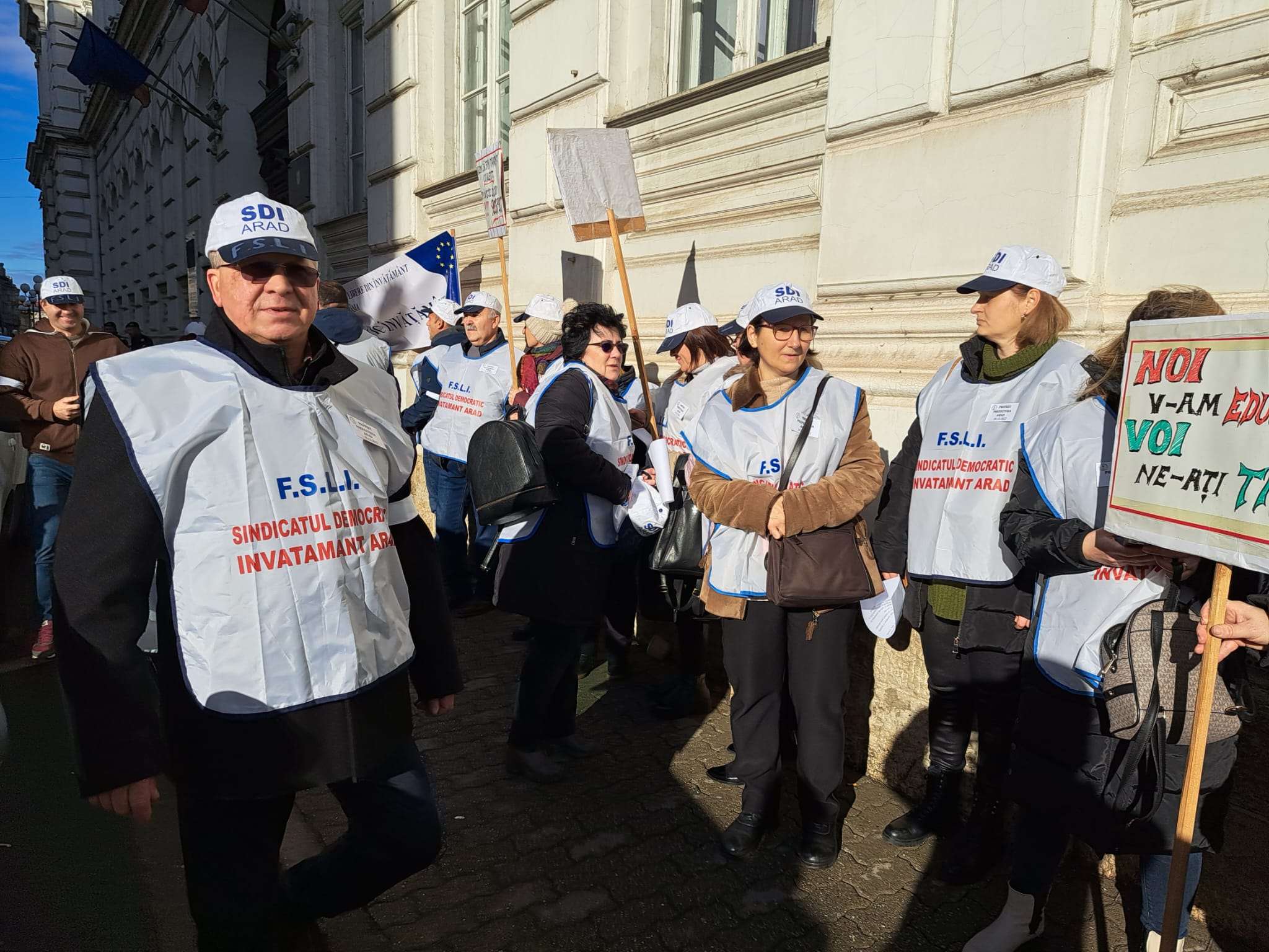 „Am ieșit astăzi în stradă pentru a protesta și pentru a atrage atenția guvernanților, decidenți politici, că nu mai suportăm să fim mințiți și umiliți. Din nou se vehiculează acea creștere salarială de 10 la sută din ianuarie, când de fapt nu este o creștere salarială, ci este aplicarea legii salarizării, care trebuia aplicată până în decembrie 2022. Acest lucru nu se întâmplă, iar promisiunea este că va fi aplicată de la 1 ianuarie 2023. Nu se poate, din nou suntem furați încă o lună. Prin ultima ordonanță de Guvern, învățământului i se alocă cel mai scăzut procent din PIB. Nu se poate, suntem din nou umiliți, ne-am săturat să fim cenușăreasa bugetarilor. Colegii prezenți aici, aproximativ 60 de persoane, protestează și pentru faptul că personalul nedidactic are salarii între 1.700 și 2.200 de lei, nu li se decontează naveta, nu beneficiază de spor de condiții speciale de muncă, în timp ce alte sectoare de muncă beneficiază de aceste sporuri”, a spus, în cadrul protestului de la Arad, Dănuț Ienășescu, președintele Sindicatului Democratic Învățământ din Arad