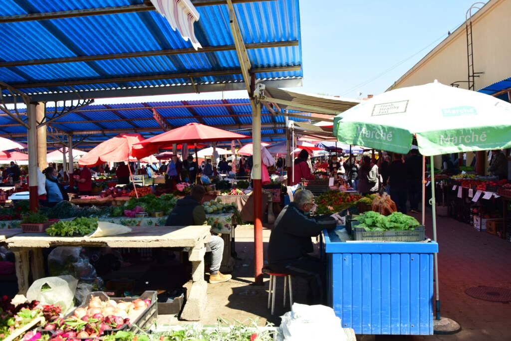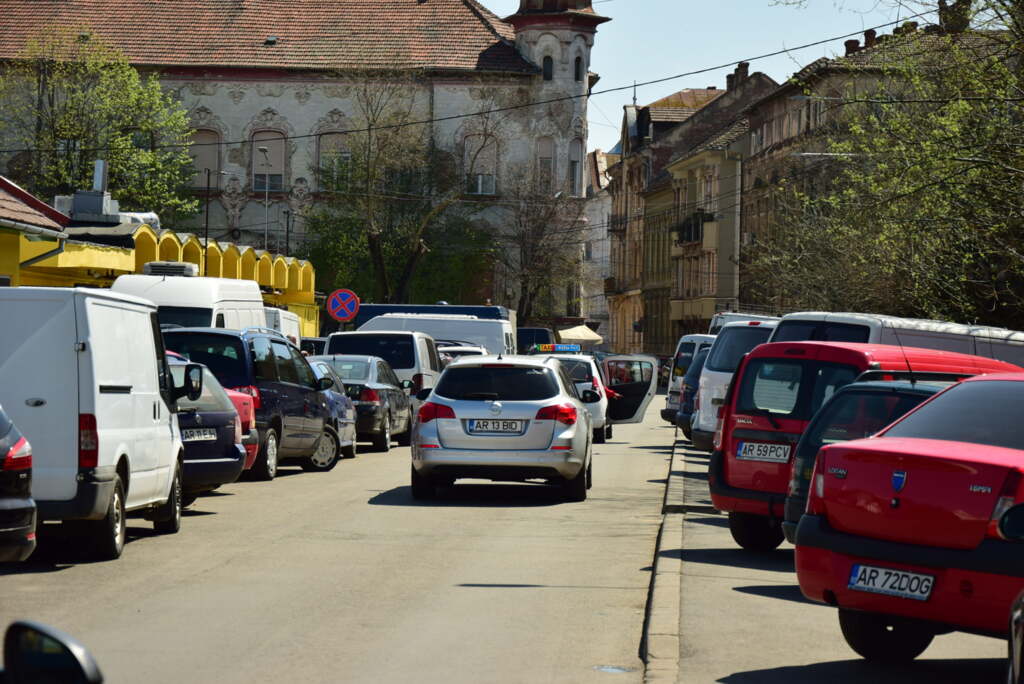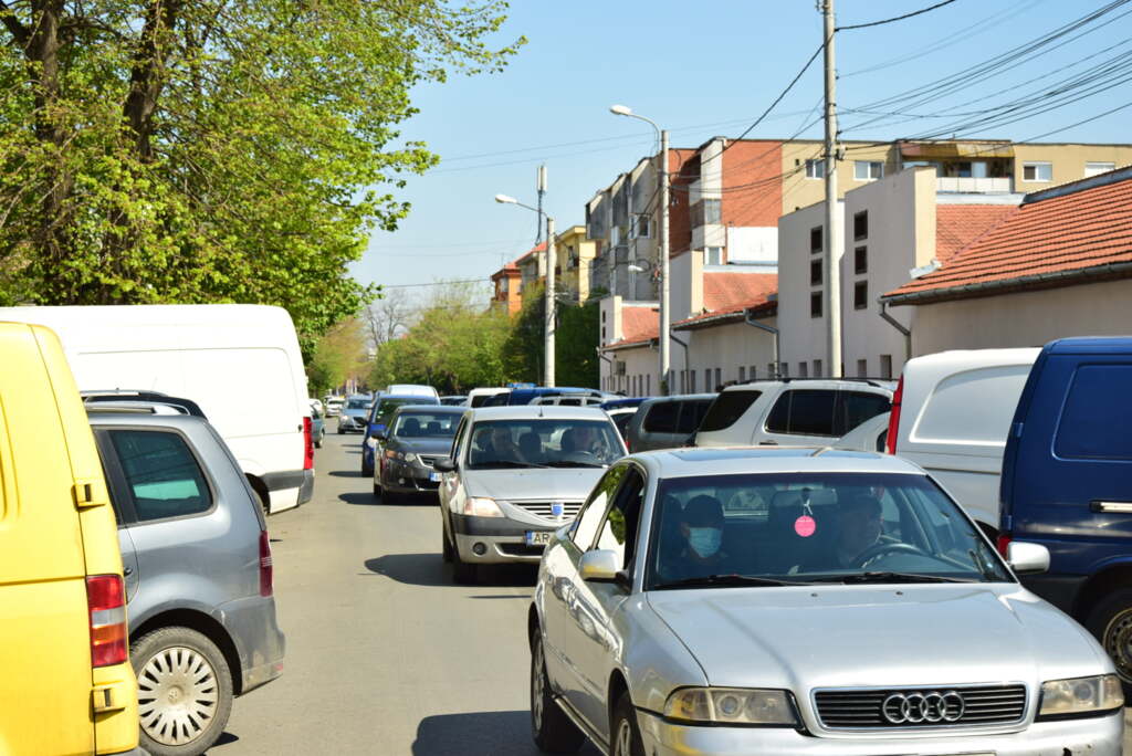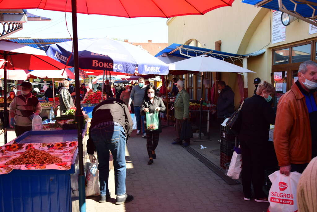 În jurul pieței Mihai Viteazul locurile de parcare au fost pline de autoturisme, circulația în jurul pieței a fost aglomerată, șoferii fiind nevoiți să stea la cozile formate în jurul pieței, pe toate laturile acesteia. În piață… forfotă mare. Pentru prima dată, de când ne deplasăm în piețele arădene, am observat că la intrarea în hala agroalimentară era prezent un echipaj al Poliției Locale Arad. Aceștia nu permiteau intrarea în hală a mai mult de 5 persoane odată. Mai mult, dinspre piață nu se putea intra în hală, fiind permisă doar ieșirea.