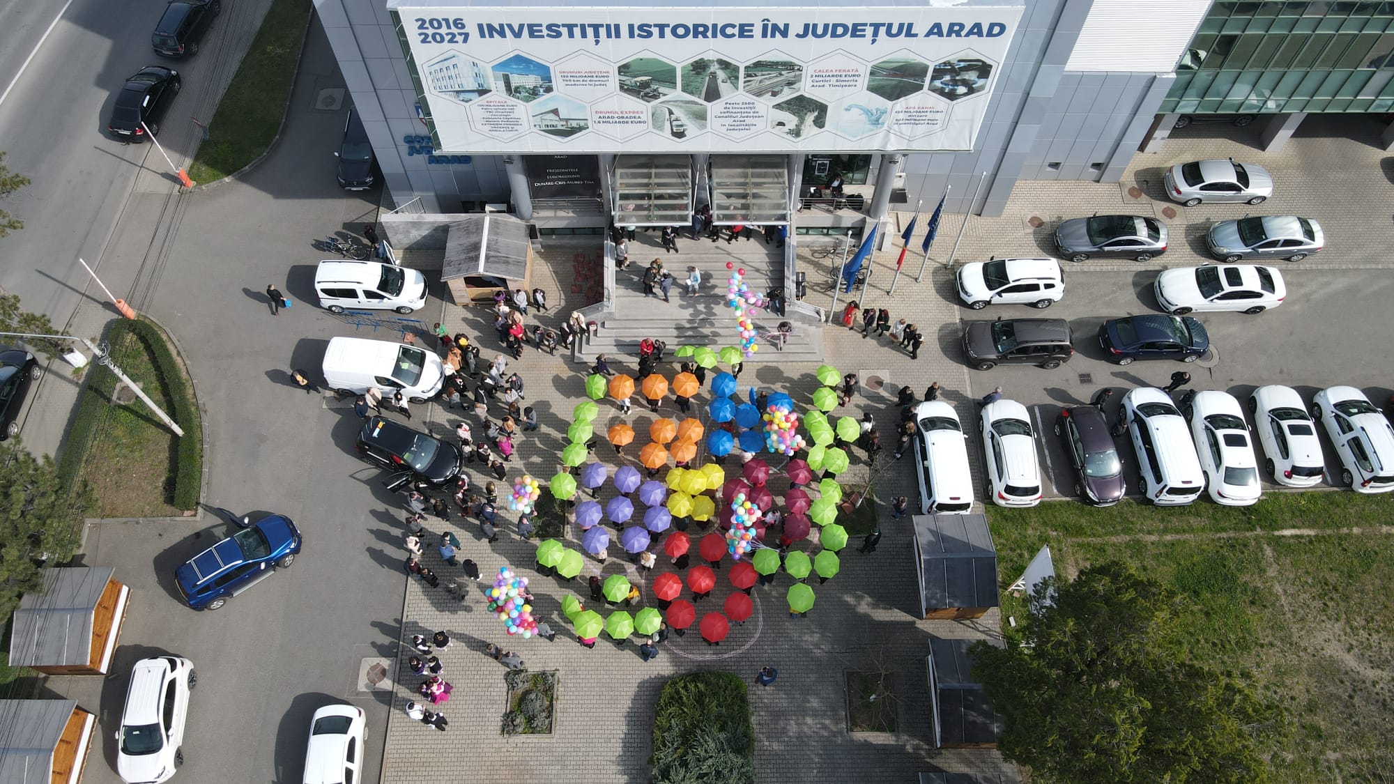 Pentru câteva minute, angajaţii DGASPC Arad, dar şi asistenţii sociali ai primăriilor din judeţ, au dansat cu umbrele colorate în mâini. Au vrut să arate astfel cât de importantă este colaborarea dintre ei pentru protecţia celor aflati în nevoie. În final, au fost lansate 300 de baloane colorate, pentru a celebra Ziua Mondială a Asistenţei Sociale, marcate în fiecare an în a treia săptămână a lunii martie.
