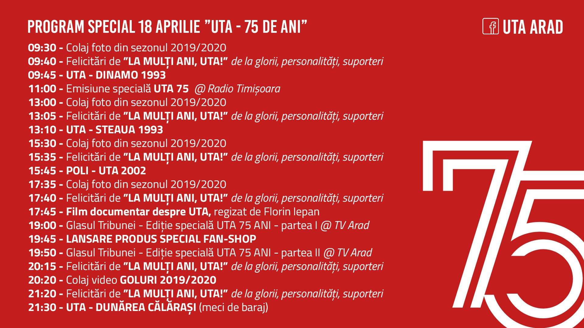 Lumea s-a schimbat de câteva săptămâni bune, iar marea sărbătoare a "Bătrânei Doamne", pregătită de club, nu se mai poate realiza. Așa se face că aniversarea a 75 de ani s-a mutat în mediul online. Mâine, e ziua cea mare, iar UTA a pregătit un program de sărbătoare, însă pe Facebook, din motive lesne de înțeles.