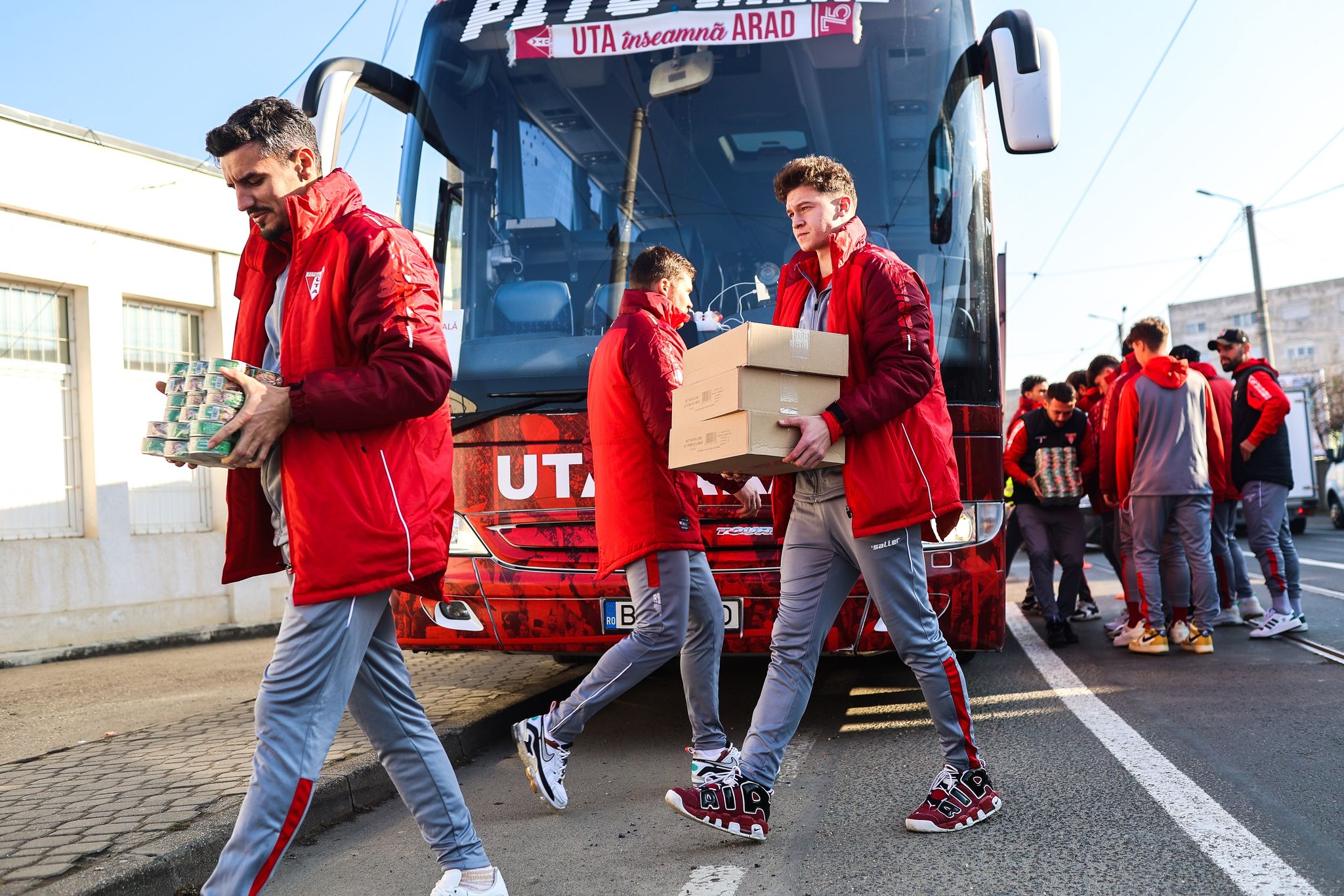 ARAD. UTA se implică în campania umanitară inițiată de Cetatea Voluntarilor pentru susținerea victimelor din Turcia. Azi dimineață, la Centrul de Colectare din curtea Universității „Vasile Goldiș”, fotbaliștii roș-albi și staff-ul tehnic au contribuit la strângerea de provizii pentru victimele cutremurelor care au lovit Turcia săptămâna trecută.