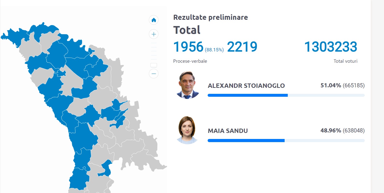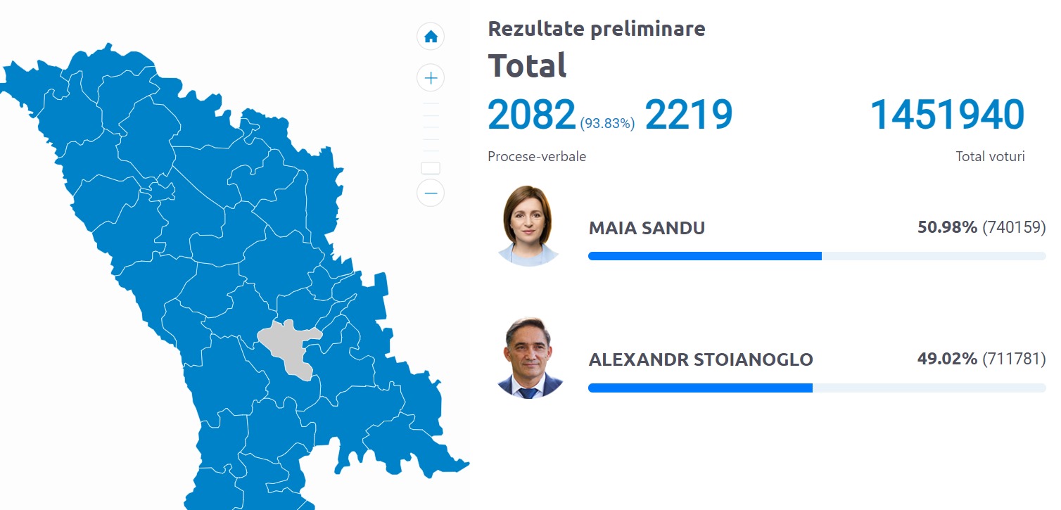 Preşedinta în exerciţiu, Maia Sandu, a preluat conducerea, în turul doi al alegerilor prezidenţiale din Republica Moldova, fiind creditată cu 50,45% după numărarea a 93% din voturile exprimate, faţă de candidatul Partidului Socialiştilor din Republica Moldova (PSRM), Alexandr Stoianoglo, care este creditat cu 49,55%, potrivit numărătorii de pe site-ul Comisiei Electorale Centrale din această republică.