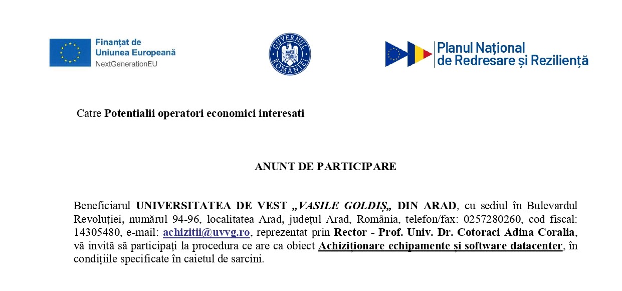 Beneficiarul UNIVERSITATEA DE VEST „VASILE GOLDIS„ DIN ARAD, cu sediul in Bulevardul Revolutiei, numărul 94-96, localitatea Arad, județul Arad, Romania, telefon/fax: 0257280260, cod fiscal: 14305480, e-mail: achizitii@uvvg.ro, reprezentat prin Rector - Prof. Univ. Dr. Cotoraci Adina Coralia, vă invita să participaţi la procedura ce are ca obiect Achizitie de echipamente pentru laboratoare didactice, defalcat pe loturi/contracte conform caietului de sarcini.