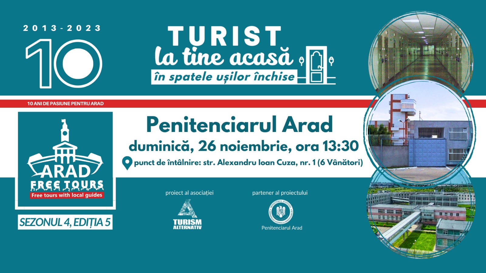 Duminică, 10 decembrie 2023, începând cu ora 15, Asociația Turism Alternativ va organiza un tur de oraș special, cu ocazia împlinirii a zece ani de la lansarea proiectului Arad Free Tours. Vor fi evocate zece personalități importante din istoria Aradului, care și-au pus amprenta în diferite moduri pe dezvoltarea orașului și vor fi vizitate zece obiective turistice din zona centrală a municipiului.