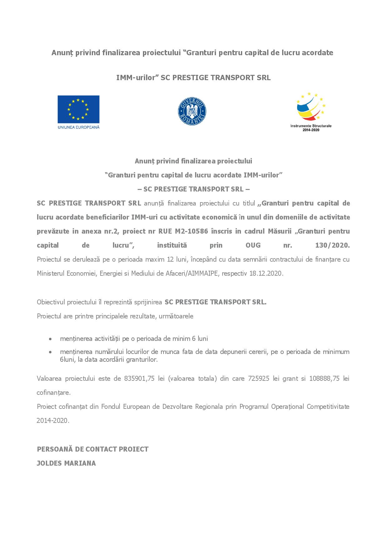 Phone Easy SRL anunță lansarea proiectului cu titlul ”Granturi pentru capital de lucru acordate beneficiarilor IMM-uri cu activitate economică în unul din domeniile de activitate prevăzute în anexa nr. 2, conform OUG 130/2020 modificată, aferente Programului Operațional Competitivitate 2014 - 2020” proiect nr. RUE M2-9463 înscris in cadrul Măsurii ”Granturi pentru capital de lucru”, instituită prin OUG nr. 130/2020.