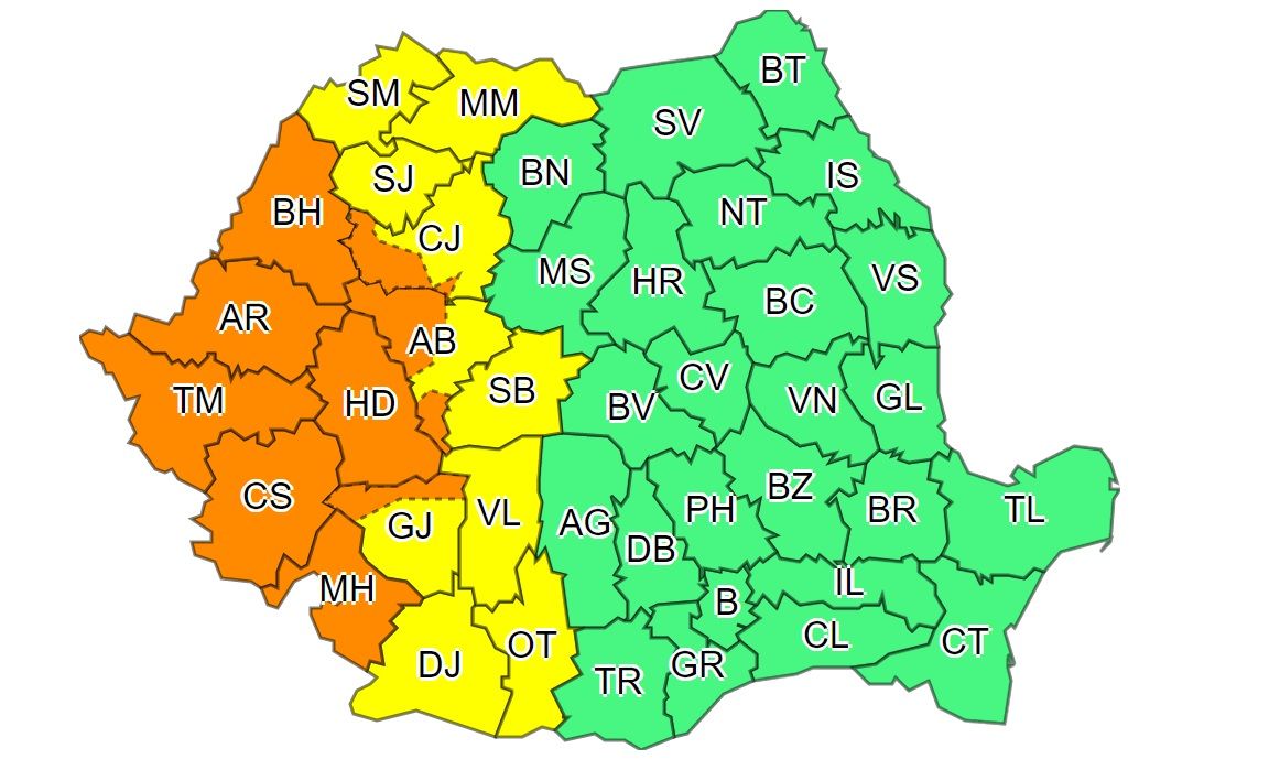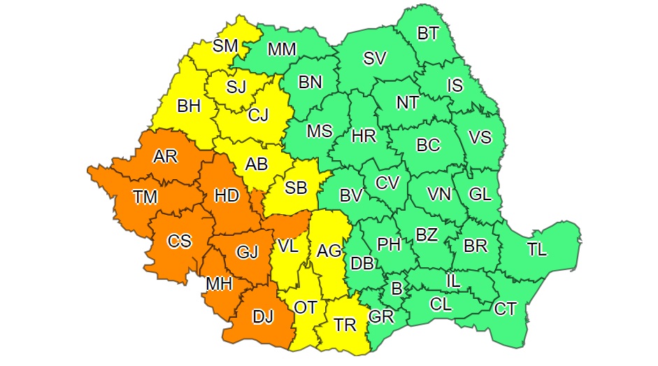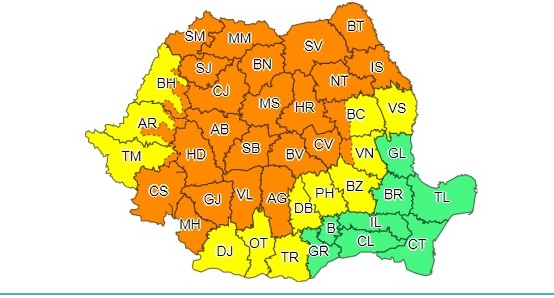 Administraţia Naţională de Meteorologie a emis sâmbătă o avertizare Cod portocaliu de instabilitate atmosferică accentuată pentru județul Arad și alte opt judeţe, valabilă de sâmbătă seara, până duminică dimineaţa, şi o atenţionare Cod galben pentru 10 judeţe, valabilă de sâmbătă după-amiază, până duminică dimineaţa.