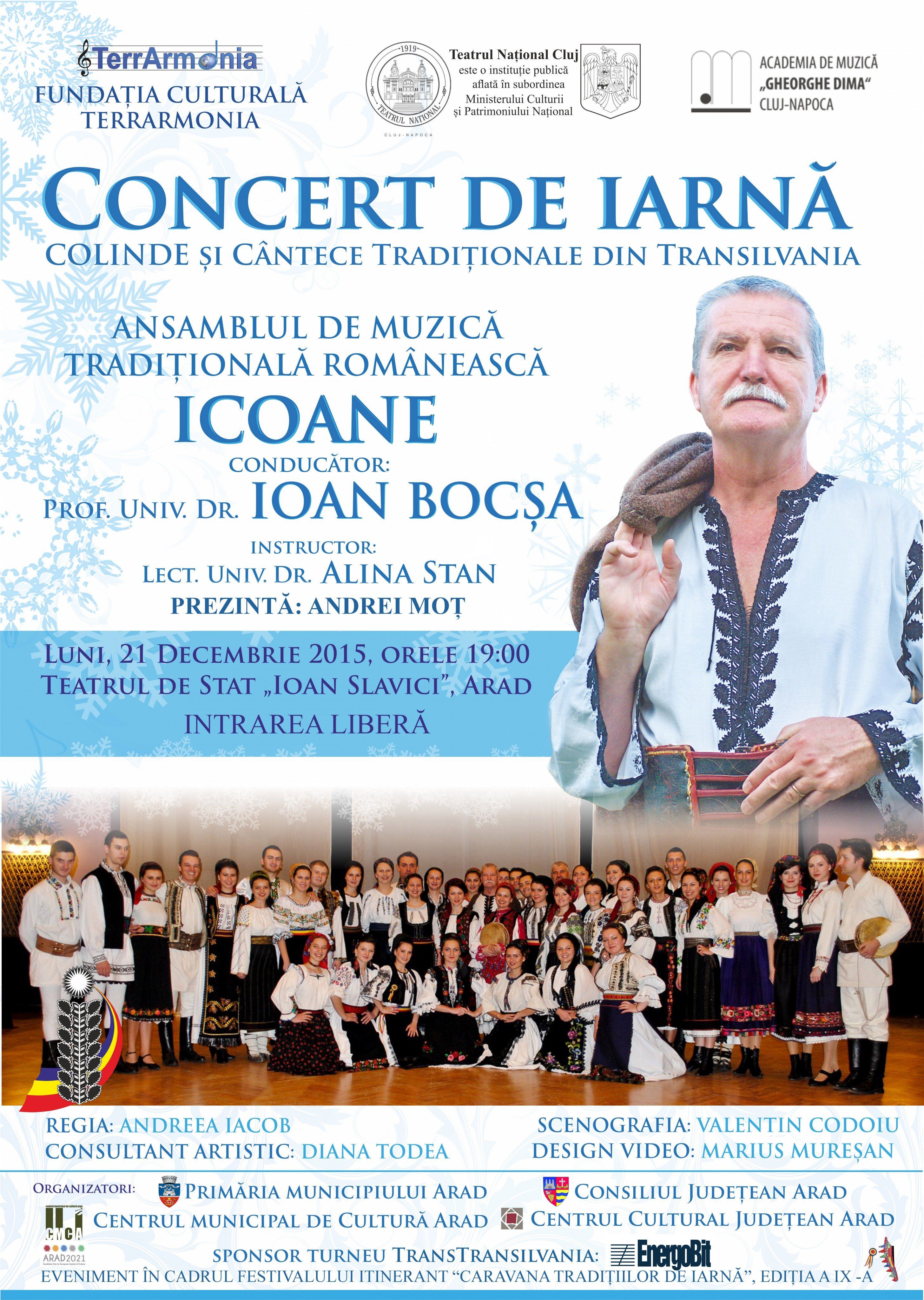 Teatrul de Stat „Ioan Slavici” va fi gazda unui concert extraordinar de colinde şi cântece tradiţionale din Transilvania. Ansamblul de Muzică Tradiţională Românească „ICOANE” al Academiei de Muzică „Gheorghe Dima” din Cluj-Napoca, condus de îndrăgitul Ioan Bocşa, va urca pe scena Teatrului luni, 21 decembrie, de la ora 19:00.
