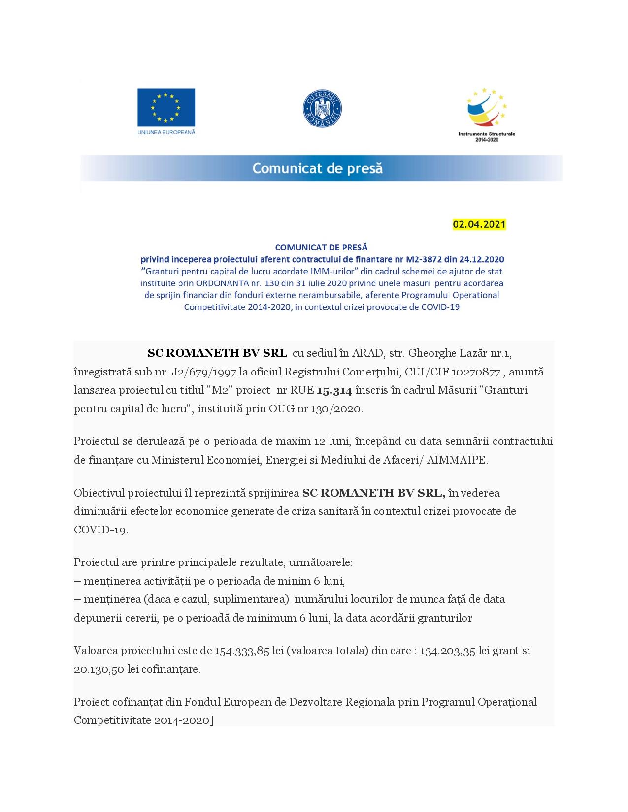SC ROMANETH BV SRL cu sediul în ARAD, str. Gheorghe Lazăr nr.1, înregistrată sub nr. J2/679/1997 la oficiul Registrului Comerţului, CUI/CIF 10270877 , anuntă lansarea proiectul cu titlul ”M2” proiect nr RUE 15.314 înscris în cadrul Măsurii ”Granturi pentru capital de lucru”, instituită prin OUG nr 130/2020.