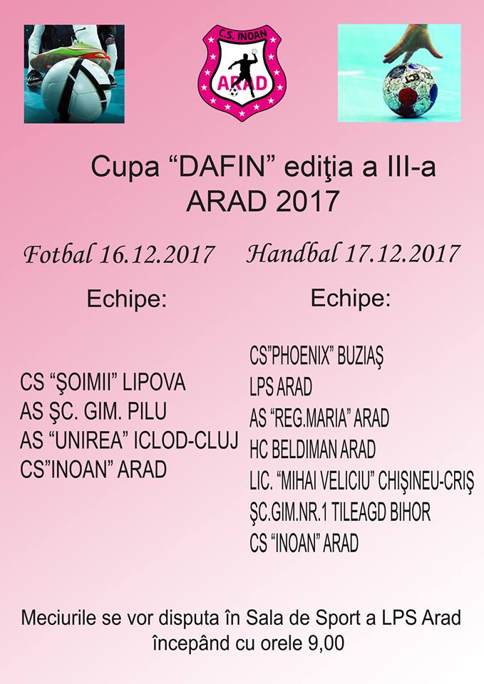 Cupa „Dafin” s-a dovedit și în acest an o pledoarie pentru fotbal și handbal în rândul micuților practicanți din județele Sălaj, Bihor și Arad. Ajunsă la ediția a IV-a, întrecerea gândită de prof. Adriana Inoan (președinte CS Inoan Arad) a avut la start echipe de fotbal conduse de: Cristian Țigan, Valentina Calalb, Titi Prutean, Raul Dreghici, Alice Cociuba, Mircea Crișan, Flavius Pogonici și Sorin Botiș, festivitatea de premiere fiind oficiată de prof.dr. Vasile Pop.