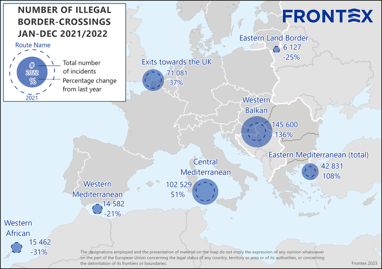 Frontex, agenţia UE de supraveghere a frontierelor şi a pazei de coastă, a publicat cel mai recent raport privind migraţia. Conform raportului, aproape jumătate din trecerile ilegale ale frontierei din 2022 au fost efectuate pe cale terestră prin regiunea Balcanilor de Vest, a declarat agenţia de frontieră a UE, Frontex. Cifrele preliminare nu includ refugiaţii ucraineni. Problema migraţiei a fost principalul aspect invocat de Austria în respingerea aderării României şi Bulgariei la Spaţiul Schengen. Datele Frontex demontează din nou afirmaţiile guvernului austriac.