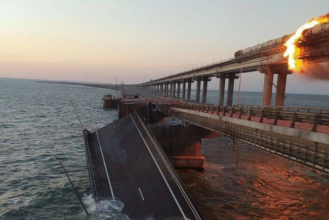O explozie puternică s-a produs, sâmbătă dimineaţă, pe Podul Kerci, care face legătura dintre Rusia şi peninsula Crimeea. Potrivit primelor informaţii, un tren cu vagoane cisternă a sărit în aer şi a produs o deflagraţie foarte mare. În imagini se vede cum o parte rutieră a podului s-a prăbuşit.