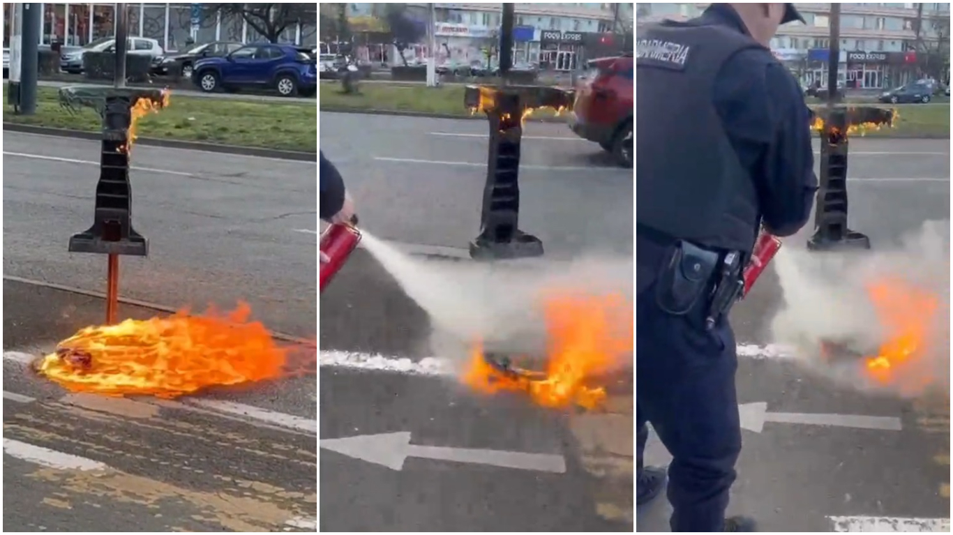 ARAD. Ce activități mai au jandarmii arădeni? Sting coșuri de gunoi care au luat foc. Și se și laudă cu asta.