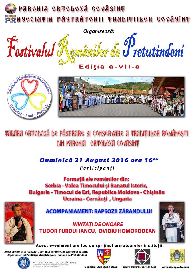 Sunt gata de sărbătoare românii de pretudindeni. Iar sărbătoarea va fi la Covăsînţ. Parohia Ortodoxă Covăsînţ şi Asociaţia Păstrătorii Tradiţiilor Româneşti organizează în data de 21 august cea de-a VII-a ediţie a „Festivalului Românilor de Pretutindeni”, un eveniment devenit deja de tradiţie. Manifestarea va avea loc la „Tabăra Ortodoxă de Păstrare şi Conservare a Tradiţiilor Româneşti” de la Covăsînţ începând de la ora 16.00.
