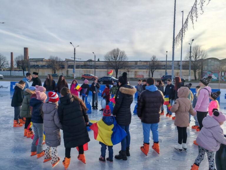 Pentru al unsprezecelea an consecutiv copiii din Corul „Sfințișorii” din Parohia Aradul Nou au încins hora Unirii pe gheață.