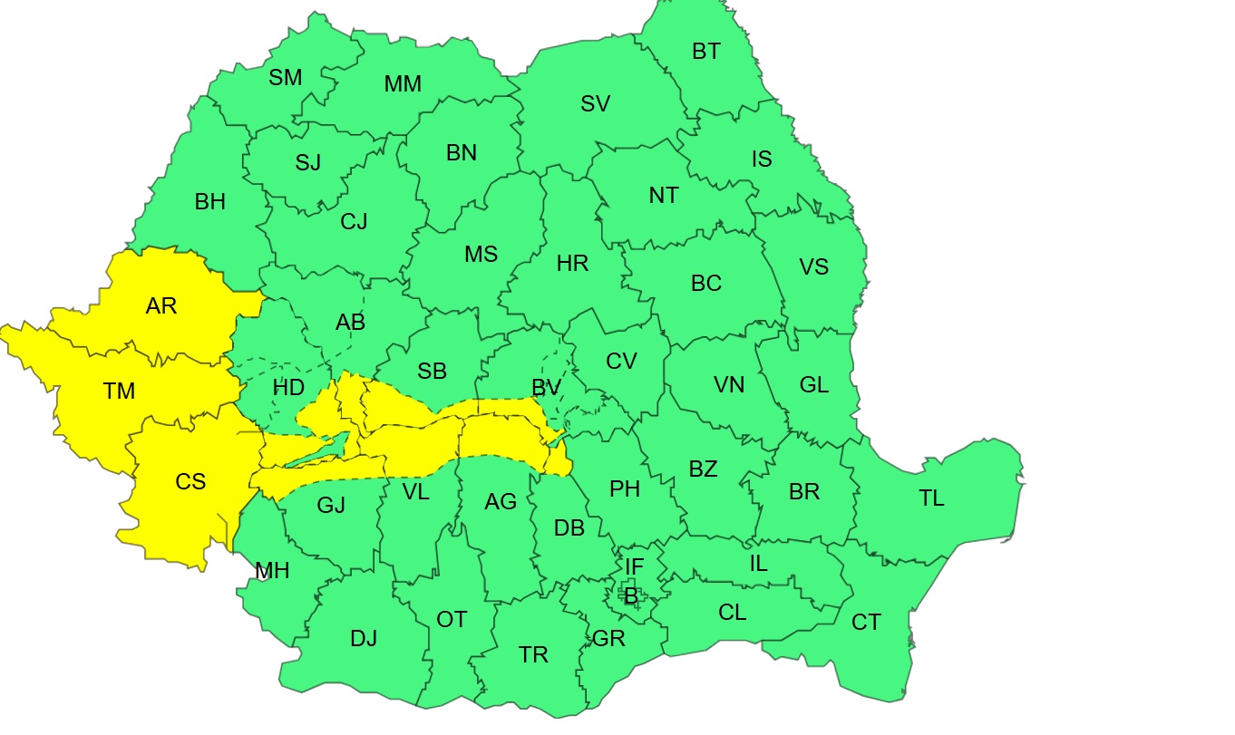 Aradul se va afla de duminică după-masa până luni dimineața sub avertizare de cod galben de vânt puternic.