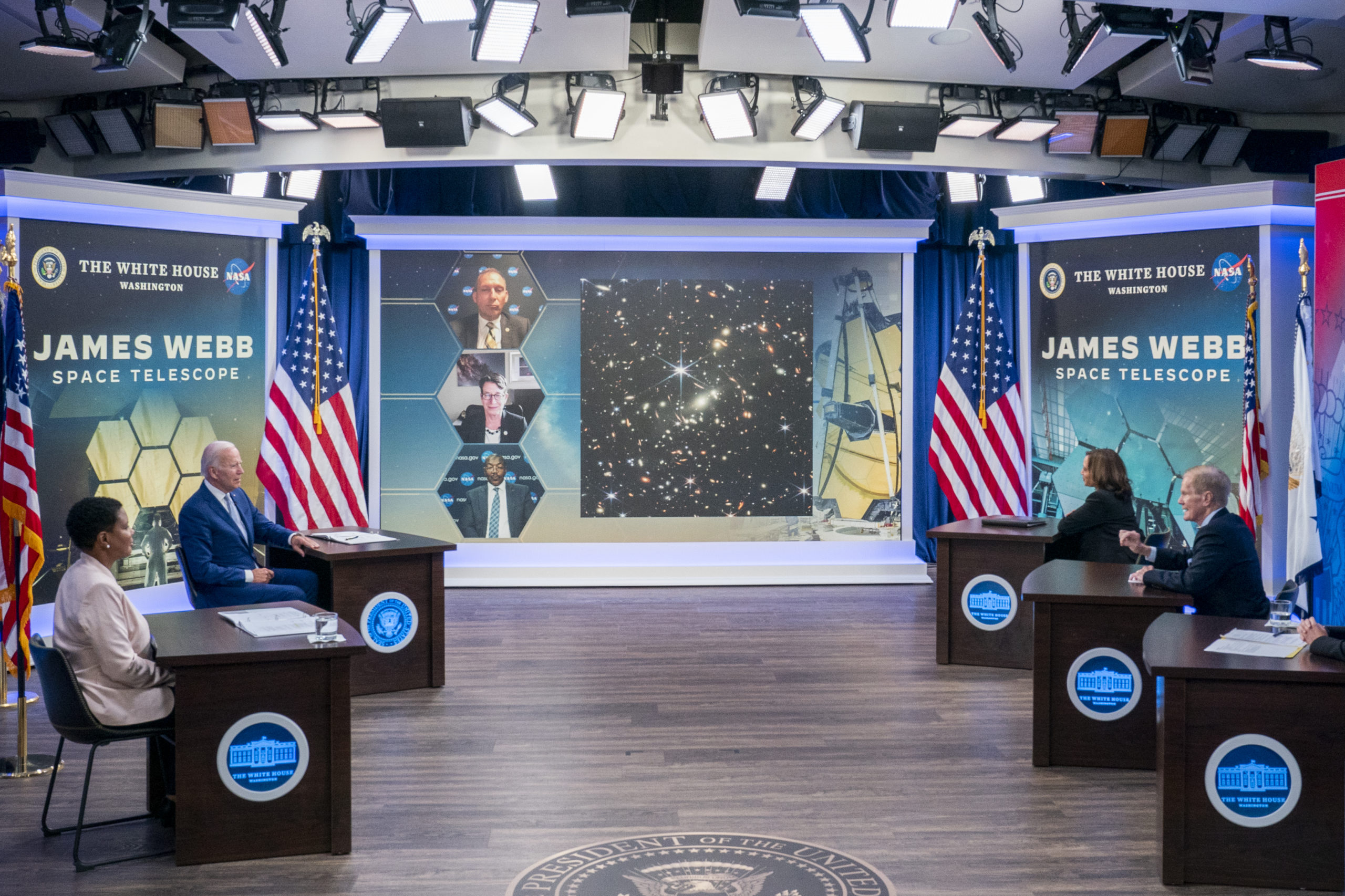 Preşedintele Joe Biden a dezvăluit această imagine a clusterului de galaxii în timpul unui eveniment de la Casa Albă luni, 11 iulie. Imaginea lui Webb acoperă un petic de cer de dimensiunea aproximativă a unui grăunte de nisip ţinut la distanţă de cineva de pe pământ şi dezvăluie mii de galaxii într-o mică fărâmă de vast univers.