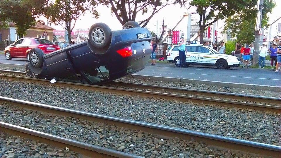 Câteva sute de pasageri din circa 10 tramvaie au fost blocaţi, vineri seara, pe una dintre cele mai important artere din municipiul Arad, în zona Gara CFR - UTA, din cauza unui carambol în care au fost implicate patru maşini, una fiind răsturnată cu roţile în sus, peste liniile de tramvai. O persoană din maşina răsturnată a fost transportată la spital.