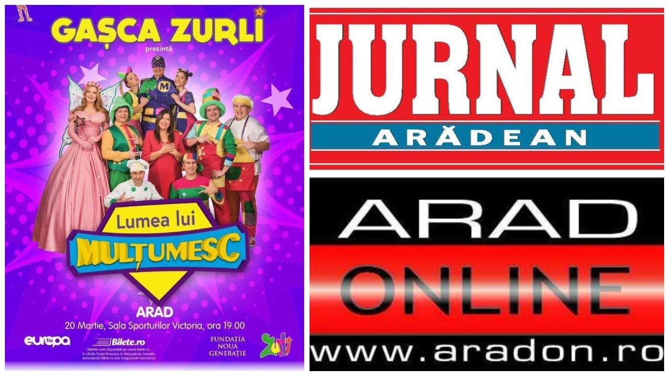 Gașca Zurli, cea mai iubită trupă pentru copii din România, vine pe 20 martie, la Arad! „Lumea lui mulțumesc” este cel mai nou spectacol pe care îl prezintă Gașca Zurli, iar Jurnal arădean și www.aradon.ro pun la bătaie 3 invitații duble la concertul de la Arad, de la Sala Polivalentă. Și asta nu e tot! Gașca Zurli și Jurnal arădean mai pun în concurs și o invitație de familie – pentru 4 persoane.