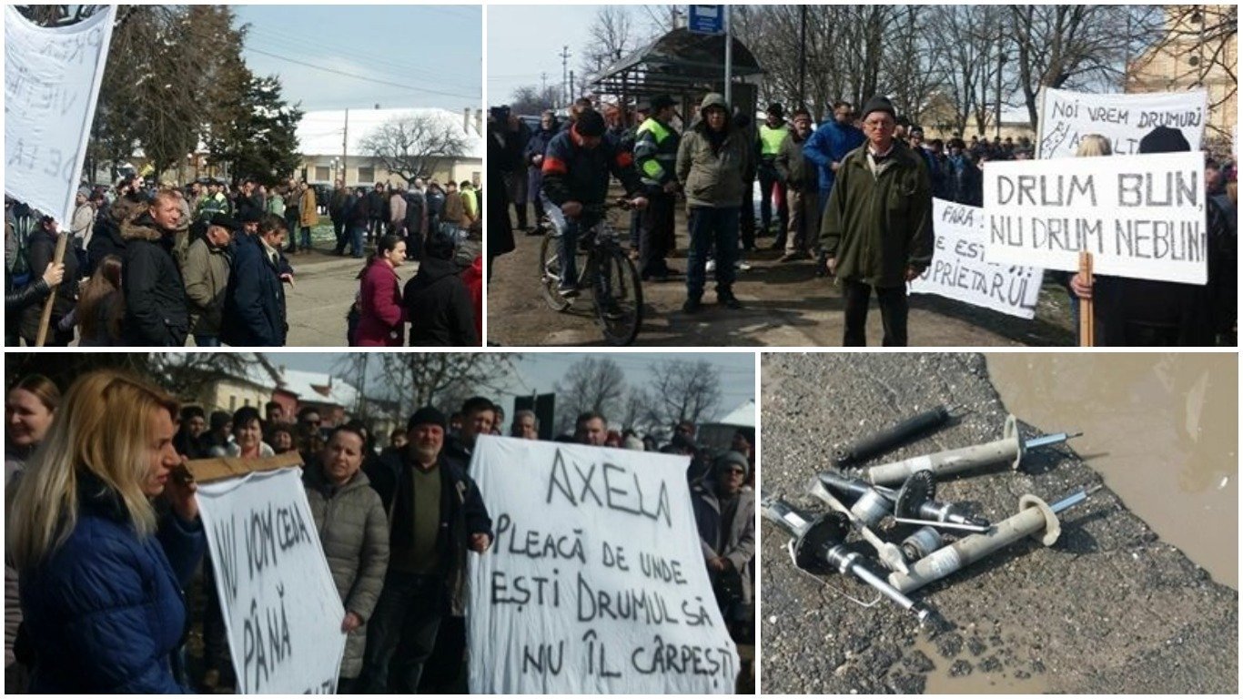 Circa 400 de persoane au participat, sâmbătă, la un protest inedit în judeţul Arad. Nemulţumiţi de degradarea tot mai mare a unui drum judeţean, oamenii au ieşit în stradă şi au umplut gropile din carosabil cu piesele auto stricate din cauza drumului, iar alte piese defecte au fost aruncate pe carosabil.