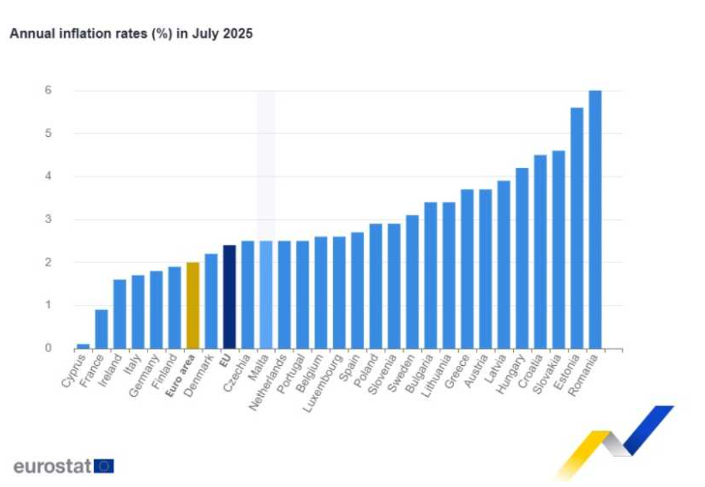 Rata anuală a inflației în Uniunea Europeană a crescut în iulie până la 2,4%, de la un nivel de 2,3% în luna precedentă, în timp ce România este în continuare țara cu cea mai ridicată inflație, cu un avans anual al prețurilor de 6,6%, arată datele publicate miercuri de Oficiul de statistică al Uniunii Europene (Eurostat).