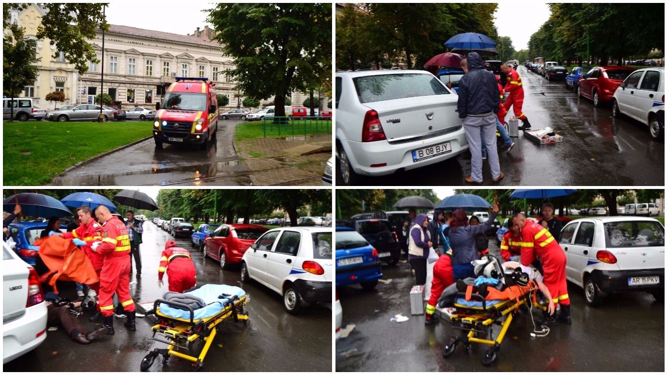 Totul s-a întâmplat în parcarea dintre liniile de tramvai de pe Bulevardul Revoluției, luni, 4 septembrie, în jurul orei 10:00, în dreptul Palatului Copiilor. Arădenii au reușit, într-o primă fază, să-l salveze pe bărbat, după manevrele de resuscitare efectuate pe carosabilul dintre liniile de tramvai.