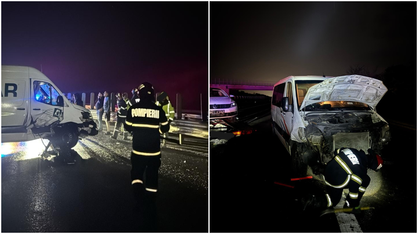 Pompierii arădeni și Serviciul de Ambulanță Județean Arad au intervenit, joi noaptea, pe A1, între Arad și Timișoara, la un accident în care au fost implicate un microbuz de transport persoane și unul de transport marfă.