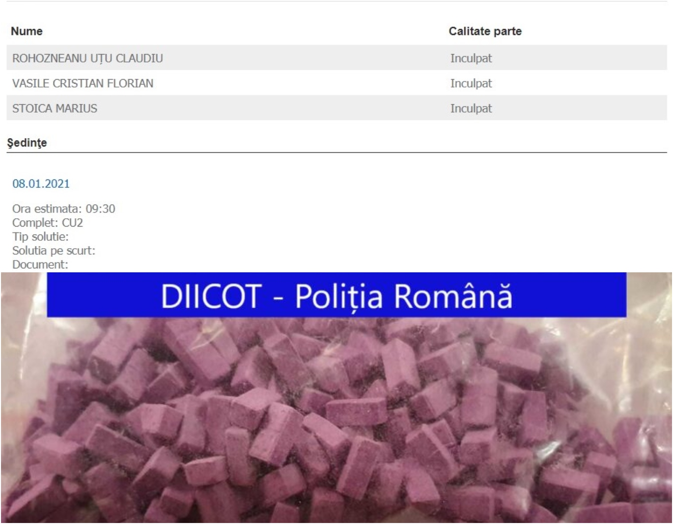 Doi cetățeni români și un cetățean olandez au fost reținuți pentru 24 de ore în urma efectuării a cinci percheziții domiciliare ce au avut loc luni, 7 februarie, pe raza județelor Arad și Ilfov. Cei trei sunt acuzați de trafic internațional de droguri de mare risc și trafic intern de droguri de mare risc. În urma perchezițiilor efectuate de DIICOT - Structura Centrală au fost ridicate 16.243 de comprimate ce conțin MDMA, având o valoare estimativă de piață de 1.300.000 de lei.