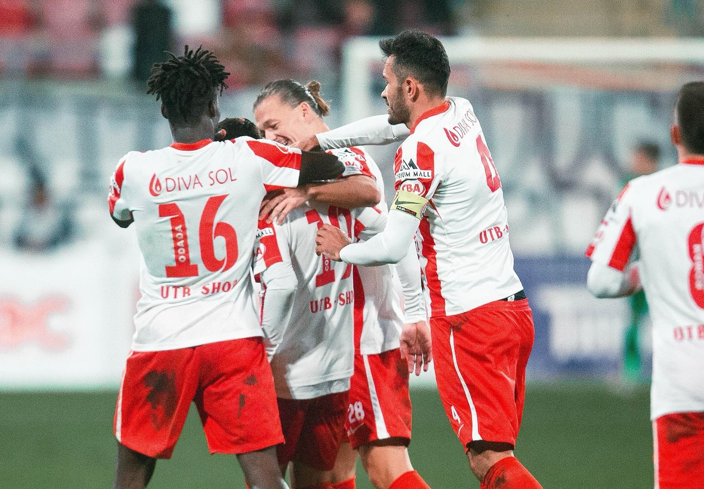 ARAD. Cu un minut înainte de pauza meciului UTA – FCSB, Odada a avut o intrare dură la Olaru, iar arbitrul Colțescu a scos direct cartonașul roșu.