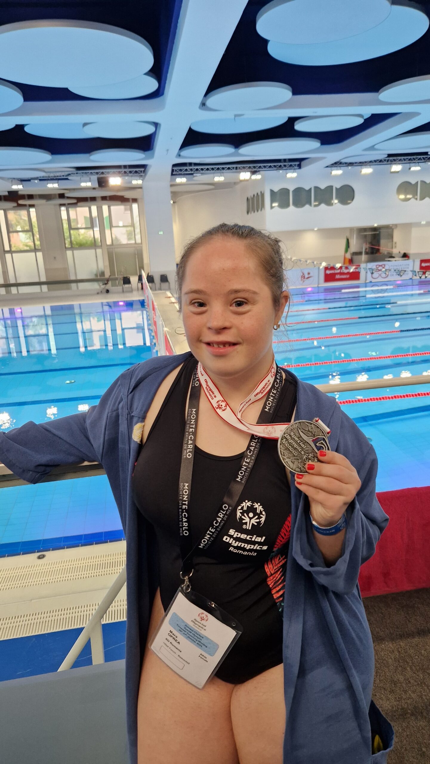 MONACO. Succes important obţinut de către arădeanca Mara Oprea la concursul de nataţie organizat de Fundaţia Special Olympics Monaco. În vârstă de 11 ani, diagnosticată cu Sindrom Down, Mara a obţinut locul II şi medalie de argint la proba de 50 metri şi locul IV şi medalie de participare la 25 metri.