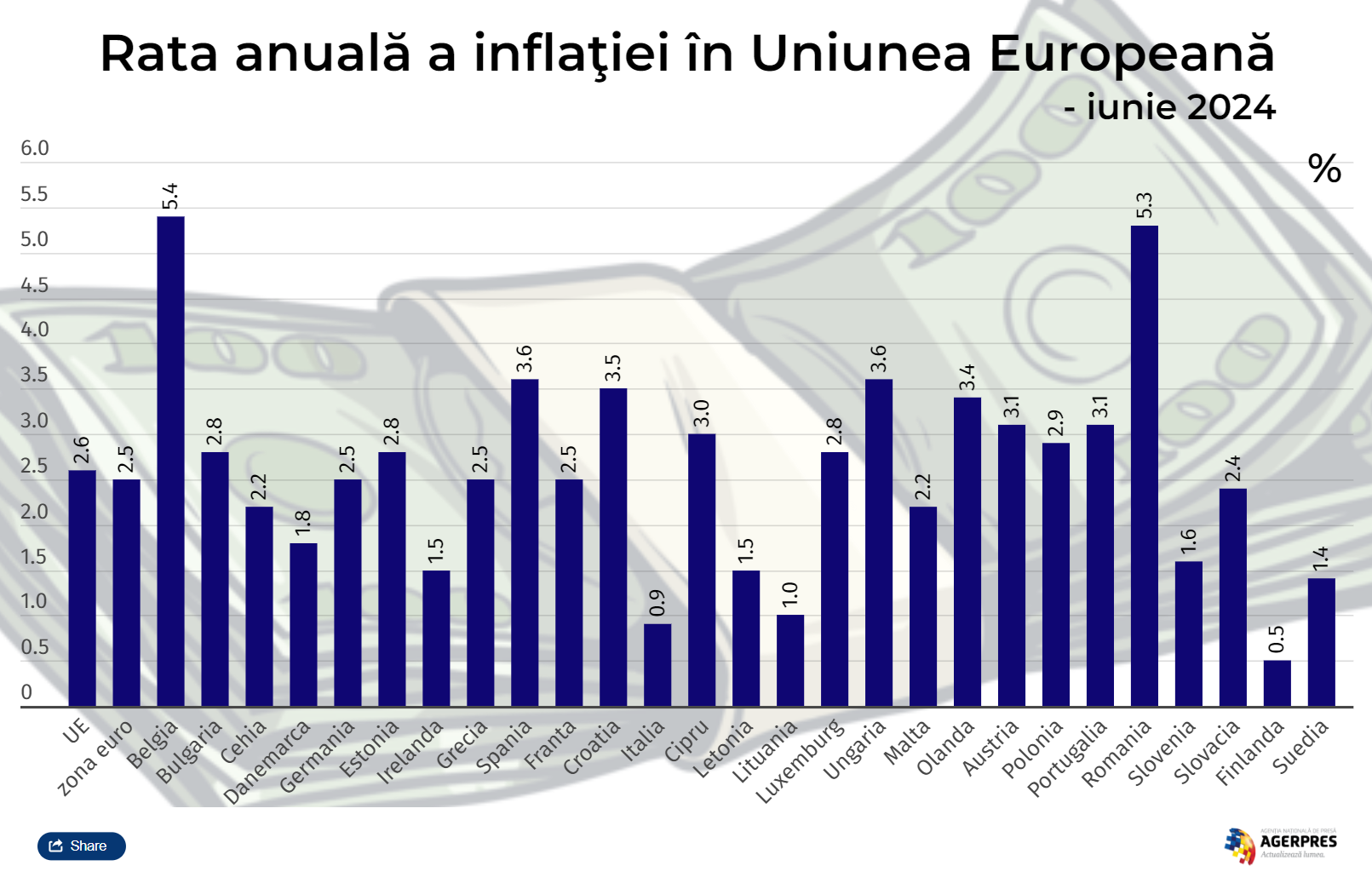 Rata anuală a inflaţiei în Uniunea Europeană s-a situat la 2,6% în iunie, în scădere faţă de 2,7% în mai, iar România, care timp de cinci luni a fost ţara cu cea mai ridicată inflaţie din blocul comunitar, a fost depăşită de Belgia luna trecută, arată datele publicate miercuri de Oficiul european pentru Statistică (Eurostat).