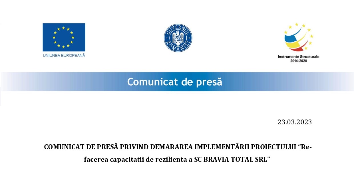 SC BRAVIA TOTAL SRL, cod de identificare fiscală 18279944, înregistrată la Registrul Comerțului sub nr. J02/34/2006, cu sediul în localitatea Arad, Str. NOUĂ, Nr. 62, Județ Arad, cod poștal 310490, România, deruleaza incepand cu data de 27.02.2023 proiectul intitulat “Refacerea capacitatii de rezilienta a SC BRAVIA TOTAL SRL” cofinanțat prin Fondul European de Dezvoltare Regională, în baza contractului de finanțare nr. 1019/POC/411/AS/10.02.2023 încheiat cu Ministerul Fondurilor Europene, în calitate de Autoritate de Management pentru Programul Operational Competitivitate (AM POC).