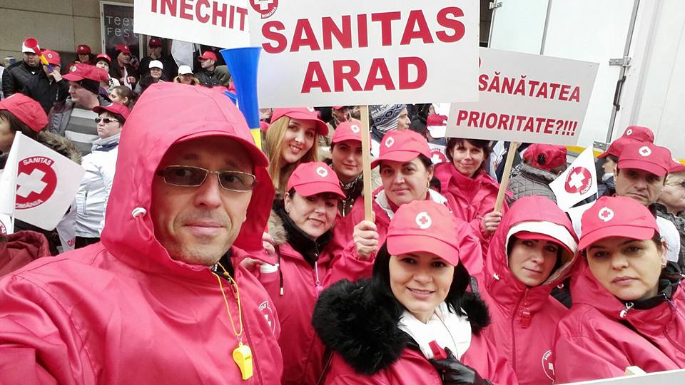 ARAD - Aproximativ 100 de cadre medicale au protestat, ieri, pe holurile Spitalului Judeţean, în curte şi în faţa policlinicii, în semn de solidaritate cu greva din Învăţământ.