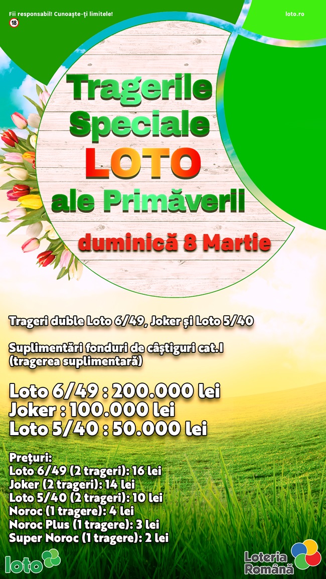 Loteria Română organizează, duminică, Tragerile Speciale Loto ale Primăverii, pentru jocurile Loto 6/49, Joker și Loto 5/40, urmând să aibă loc două trageri, una principală și una suplimentară, potrivit unui comunicat al instituției.