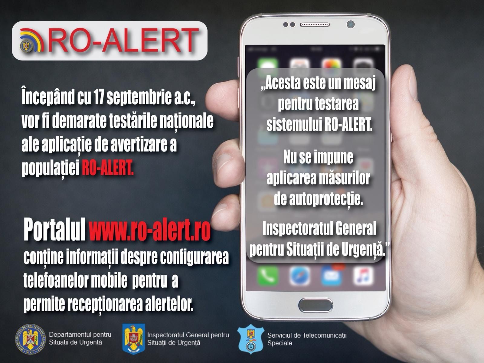 În perioada următoare, Departamentul pentru Situații de Urgență, prin Inspectoratul General pentru Situații de Urgență, în colaborare cu Serviciul de Telecomunicații Speciale, va realiza o nouă rundă de testări ale Sistemului RO-ALERT. Activitatea are scopul de a examina funcționarea sistemului prin transmiterea unor mesaje de test către telefoanele mobile aflate în raza celulelor de telefonie mobilă din anumite zone.