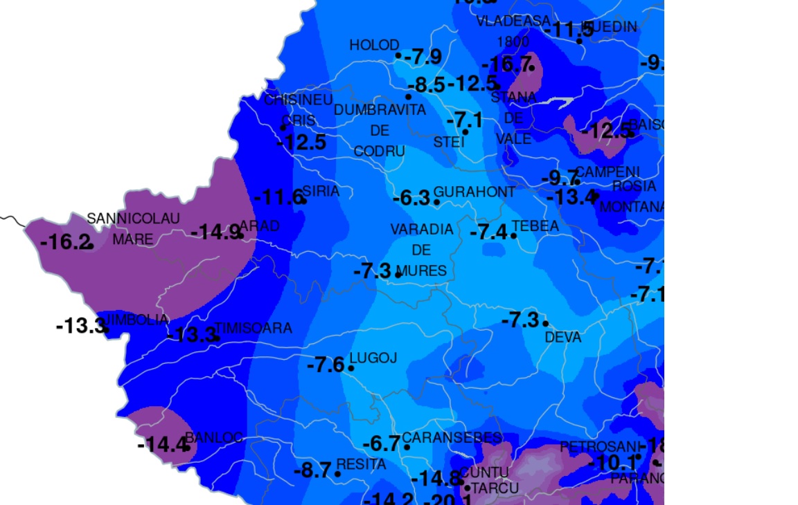 Noaptea de duminică spre luni, 11 spre 12 ianuarie, a fost una extrem de friguroasă în municipiul Arad, temperaturile ajungând aproape de -15 grade Celsius.