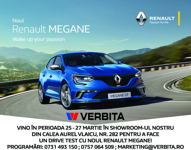 La sfârșitul săptămânii trecute a avut loc lansarea oficială a celui mai nou model din gama Renault. Astfel, la sediul SC Verbiță, dealer autorizat Dacia și Nissan din Calea Aurel Vlaicu, numărul 282, a sosit noul Renault Megane, autoturism care reprezintă a patra generației de vehicule Megane. Autoturismul a putut să fie testat de către toate persoanele interesate în a se familiariza cu noua tehnologia propusă de concernul francez Renault într-o serie de drive test-uri care au durat de vineri până duminică.