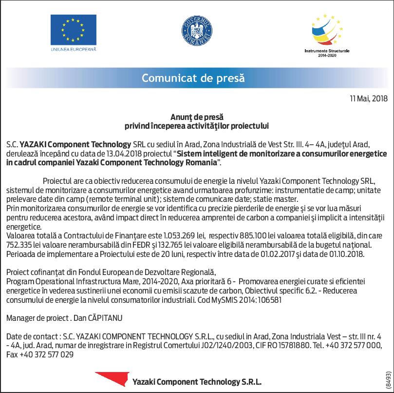 În luna Ianuarie 2019 s-a finalizat implementarea proiectului ”Sistem inteligent de monitorizare a consumurilor energetice in cadrul companiei Yazaki Component Technology Romania”, cod SMIS 106581, proiect cofinanțat prin Fondul European de Dezvoltare Regională prin POIM 2014-2020, Axa prioritară 6 - Promovarea energiei curate si eficientei energetice în vederea susținerii unei economii cu emisii scăzute de carbon, Obiectivul specific 6.2. - Reducerea consumului de energie la nivelul consumatorilor industriali.
