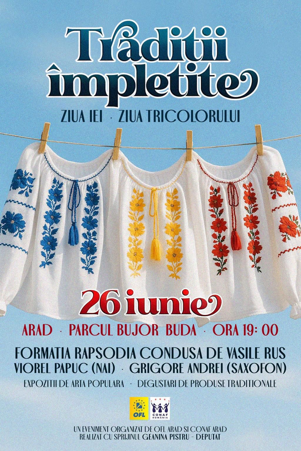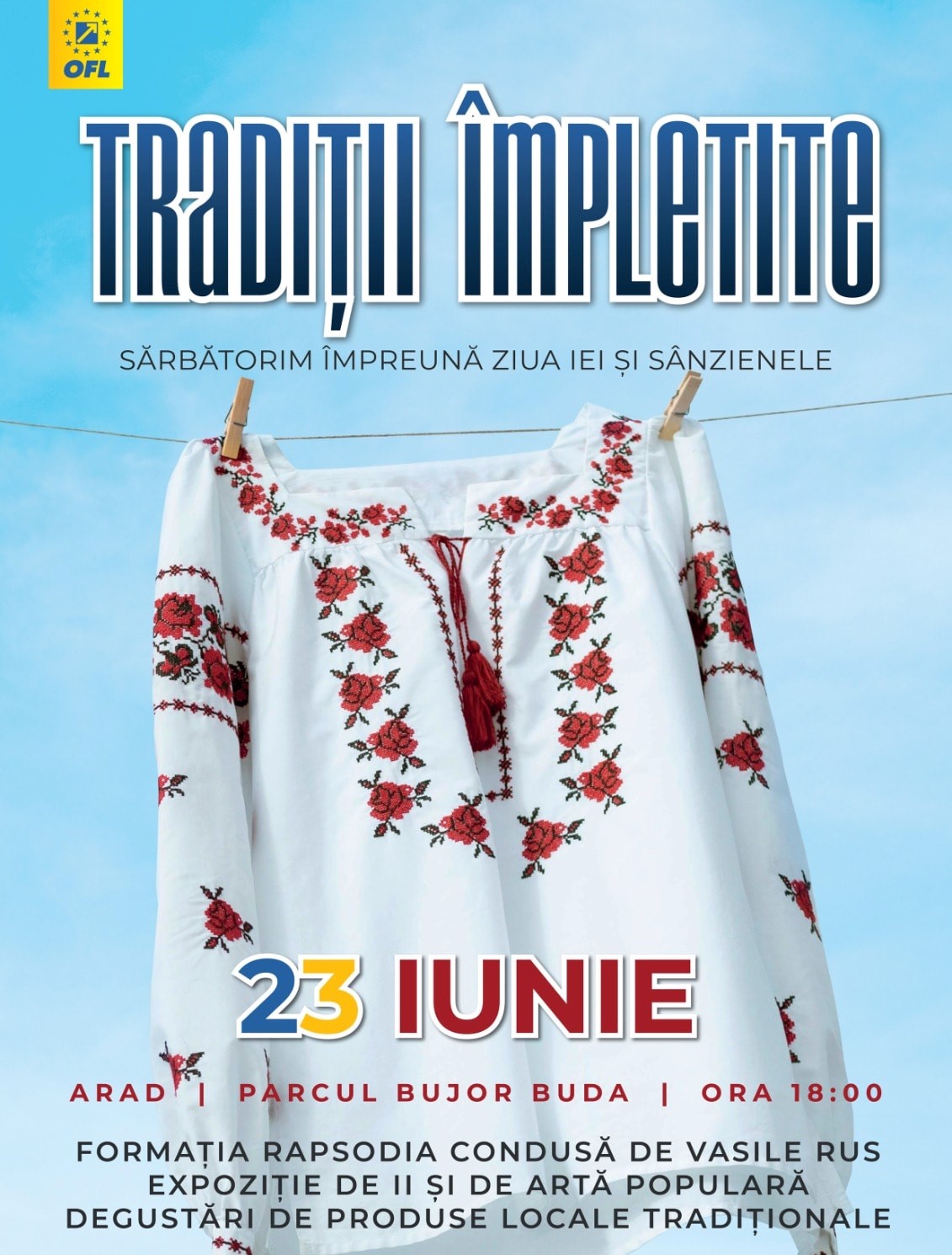 Obiceiurile românești au fost în centrul evenimentului organizat de OFL Arad, „Tradiții împletite”, în care au serbat Ziua Iei și Sânzienele. În parcul Bujor Buda arădenii au putut admira costume superbe, cu tradiționala ie în prim-plan! La standurile amenajate, au putut fi degustate produse tradiționale din părțile Aradului.