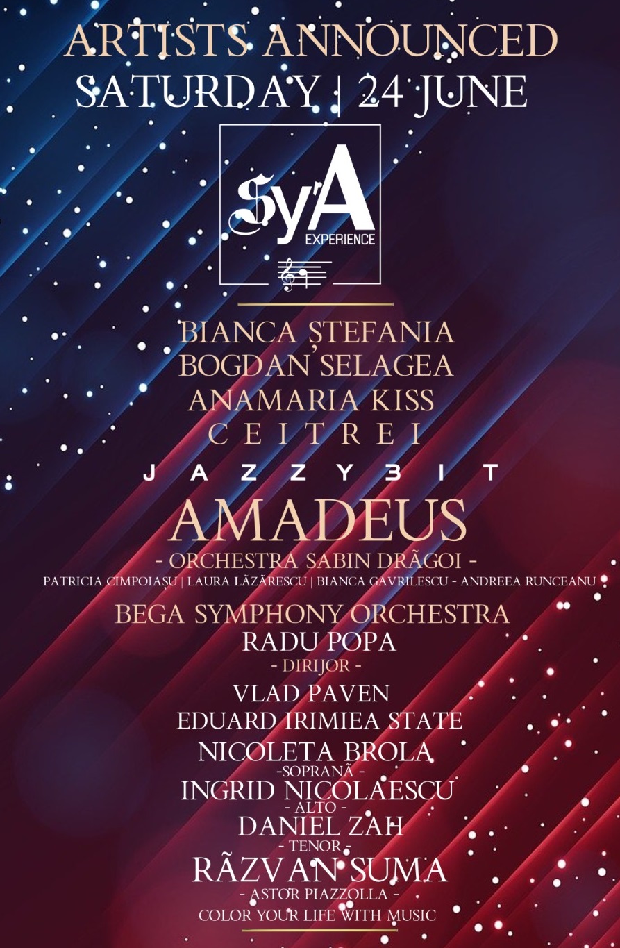 ARAD. Bega Symphony Orchestra, sub bagheta reputatului dirijor Radu Popa, este numele orchestrei simfonice care va concerta pe scena Festivalului SYA Experience în seara de sâmbătă, 24 iunie. Colaborarea cu orchestra condusă de la pupitrul dirijoral de Radu Popa reprezintă o concretizarea intenției organizatorilor de a celebra faptul că în acest an Timișoara este Capitală Europeană a Culturii, iar invitarea muzicienilor timișoreni pentru programul care va încheia ediția din acest an a SYA se dorește o reafirmare a faptului că Festivalul SYA se înscrie într-un circuit regional al spectacolelor de calitate.