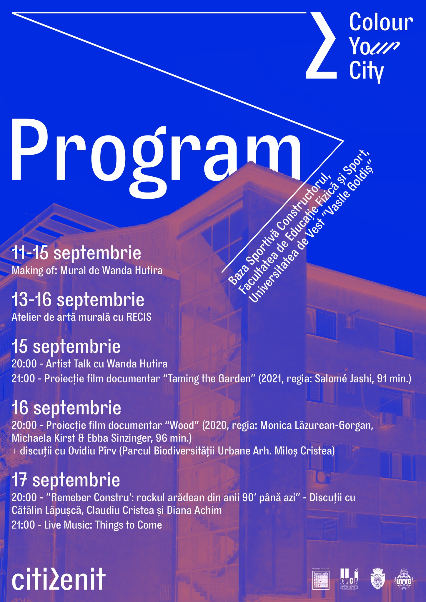 Se va întâmpla pe malul Mureșului, la Baza Sportivă „Constructorul”, între 11 și 17 septembri. „Hai cu noi să inaugurăm cel mai nou mural din Arad, rămâi la un film, stai la o discuție sau vino la concert. Avem mai multe evenimente pregătite la Baza Sportivă Constructorul a Universității de Vest Vasile Goldiș, în cadrul noului proiect citizenit Colour Your City” – e invitația celor de la asociația Citizenit.