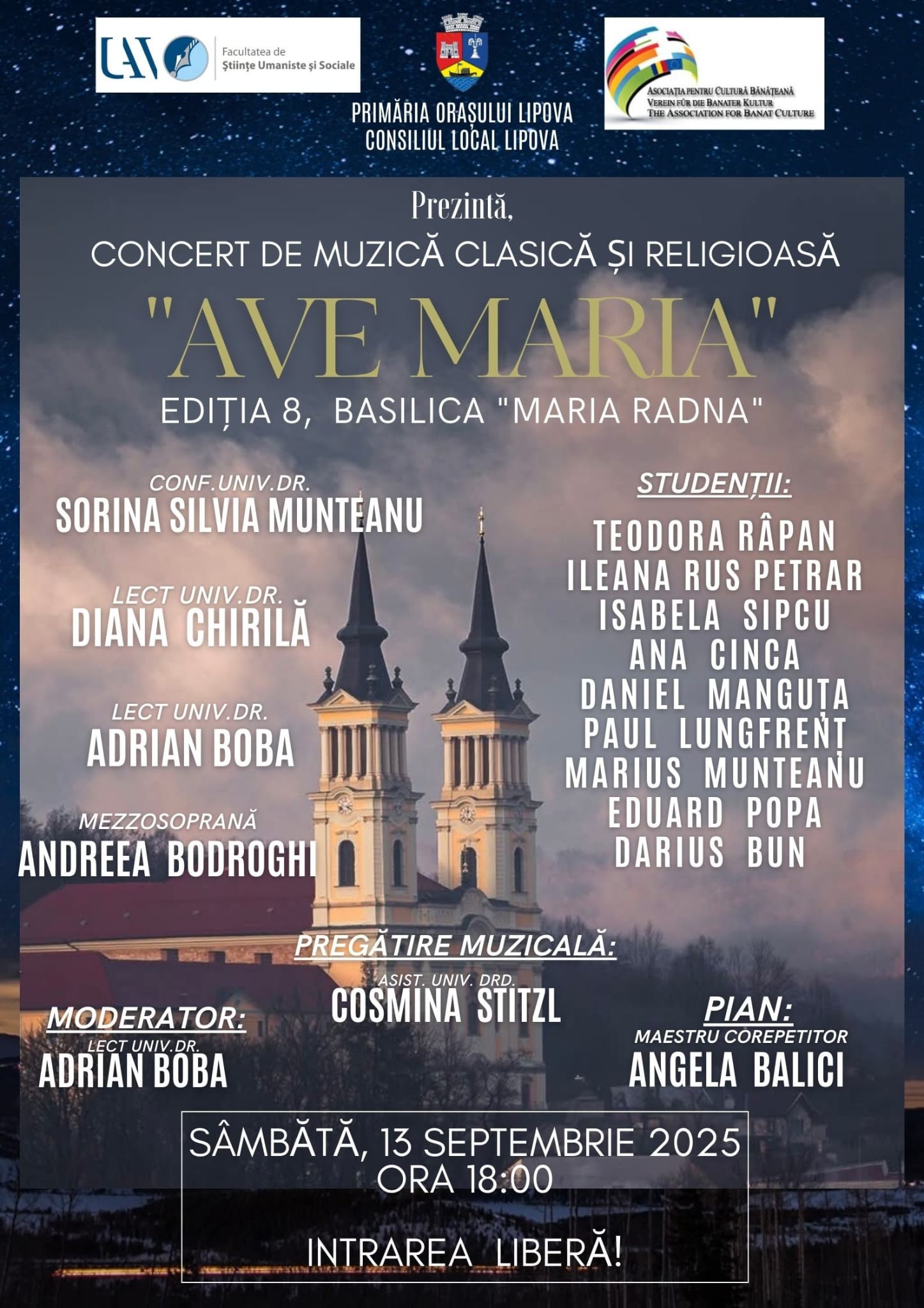 „Vă așteptăm cu toții la Bazilica Maria Radna, sâmbătă, 13 septembrie, pentru a trăi împreună o seară de excepție. Fie ca muzica să ne atingă sufletele și să ne aducă mai aproape de frumusețea și liniștea eterne”, a transmis Adrian Antoche, viceprimarul orașului Lipova.