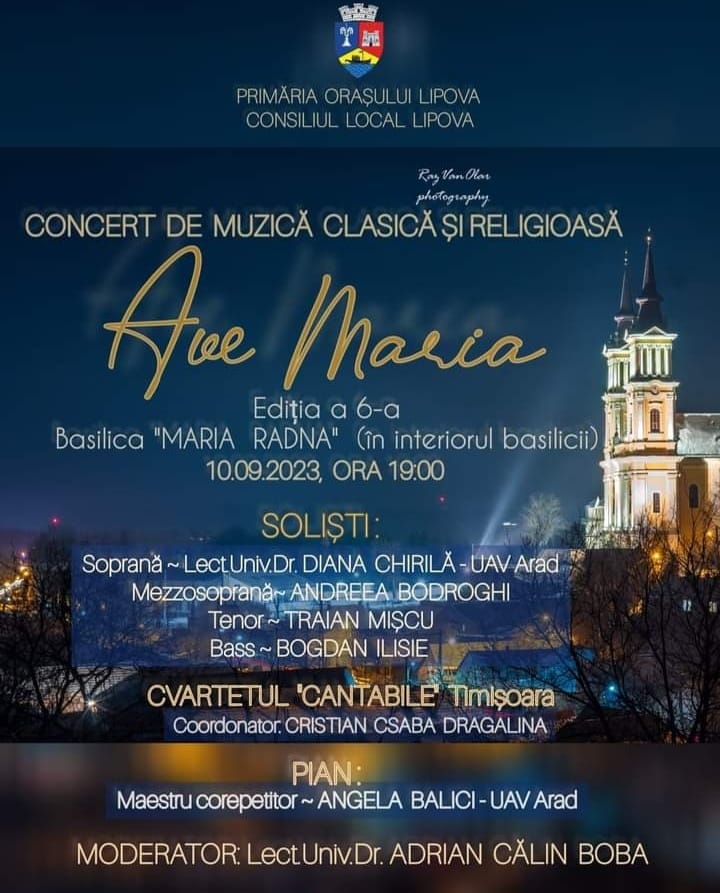 Concertul de muzică clasică și religioasă Ave Maria, aduce în interiorul basilicii Maria Radna nume de referință ale acestui gen muzical. Alături de Andreea Bodroghi vor concerta soprana Diana Chirilă, tenorul Traian Mișcu și basul Bogdan Ilisie. Va fi de asemenea prezent în concert și cvartetul Cantabile din Timișoara, condus de Cristian Csaba Dragalina. Moderator va fi lect. univ. dr. Adrian Călin Boba.