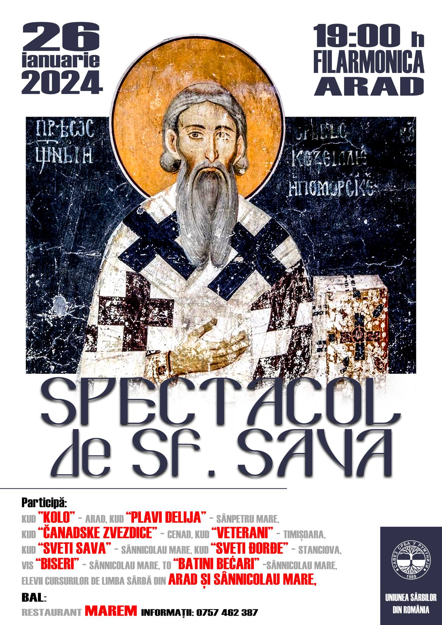 Sărbătoarea lui Sveti Sava va fi marcată, ca în fiecare an, de un spectacol special, pe scena Filarmonicii Arad. De la ora 19, vor urca pe scenă ansamblurilor „Kolo” din Arad, „Plavi Delija” din Sânpetru Mare, „Čanadske Zvezdice” din Cenad, „Veterani” din Timișoara, „Sveti Sava” din Sânnicolau Mare, „Sveti Đorđe” din Stanciova, „Biseri” din Sânnicolau Mare, dar și orchestra de tamburași „Batini Bećari” din Sânnicolau Mare. Pe scenă vor mai urca și elevii cursurilor de limbă sârbă organizate de Uniunea Sârbilor din România la Arad și Sânnicolau Mare.