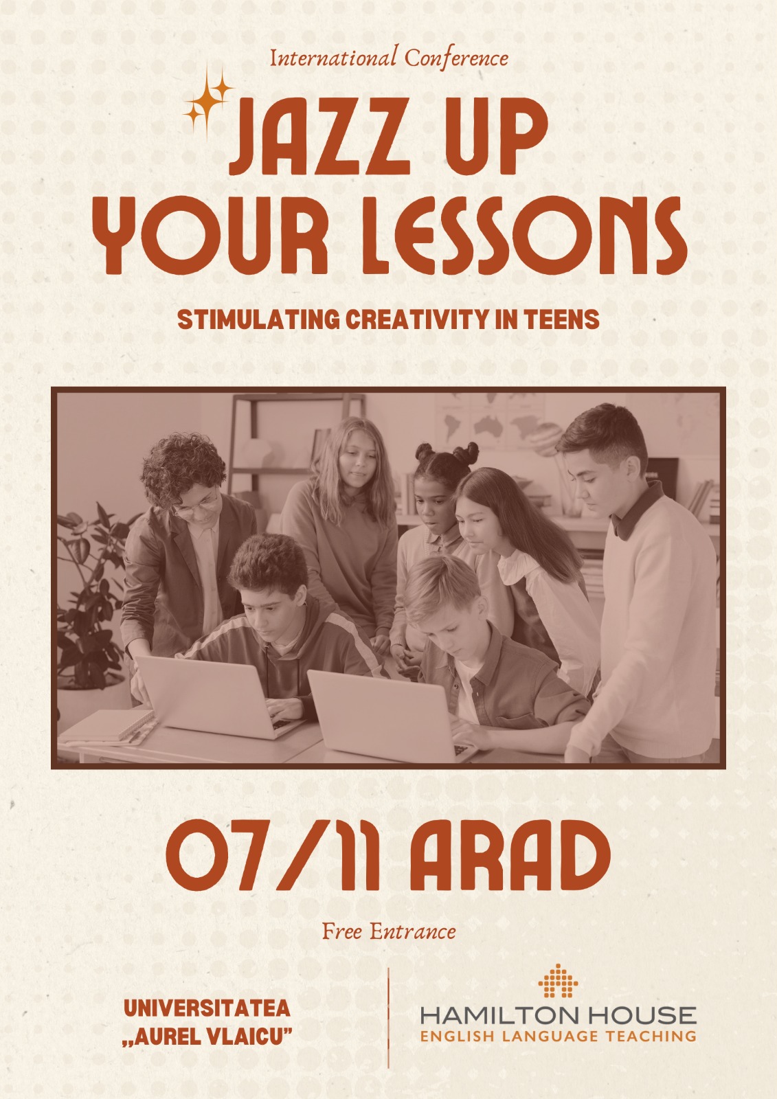 Educatorii și pasionații de limba engleză sunt invitați să participe la a doua ediție a Conferinței de Limba Engleză „Jazz up your lessons! Stimulating creativity in teens”, care va avea loc vineri, 7 noiembrie 2025, începând cu ora 13, la Universitatea „Aurel Vlaicu” din Arad, strada Elena Drăgoi nr. 2-4, Aula Magna.