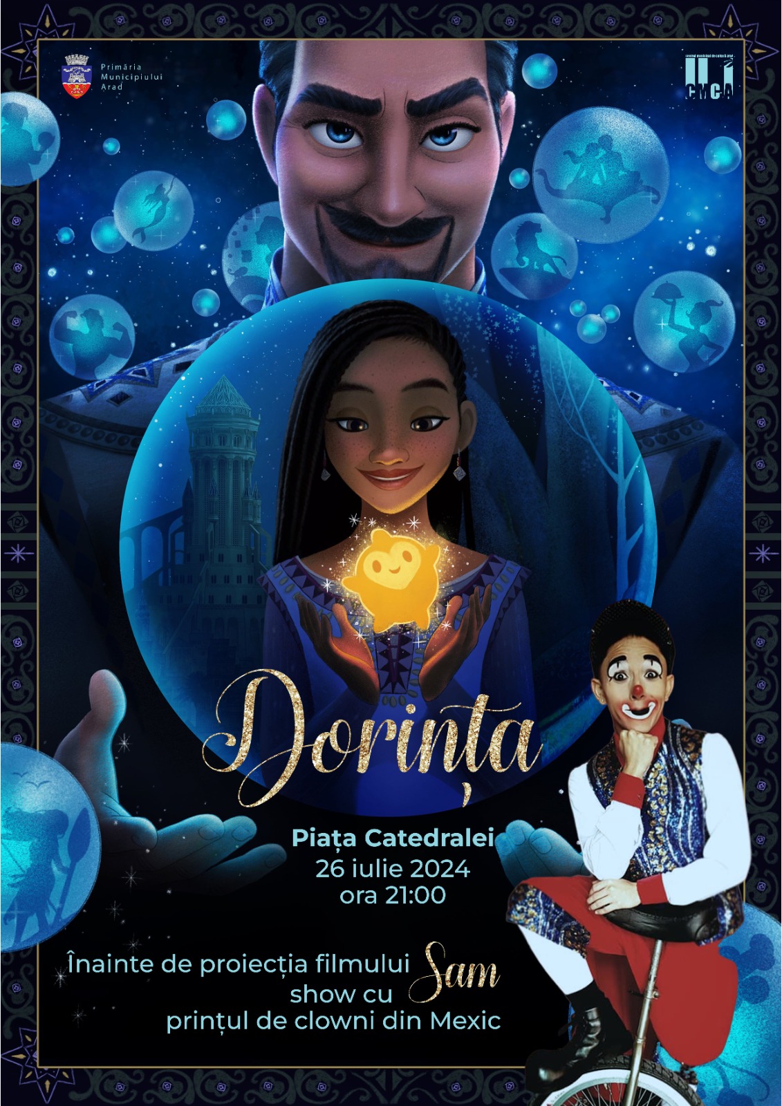 „Animația <Dorința>, produsă de studiourile Walt Disney, este o comedie muzicală care invită publicul în regatul magic Rosas unde Asha, o idealistă isteață își pune o dorință atât de puternică, încât îi este îndeplinită de o forță cosmică, o mică minge de energie numită Star. Asha și Star îl înfruntă pe suveranul din Rosas, Regele Magnifico, cu scopul de a-și salva comunitatea și pentru a dovedi că, atunci când voința unui om curajos se unește cu magia stelelor, se pot întâmpla lucruri extraordinare. Fie că este vorba de Geppetto privind stelele, dorindu-și ca Pinocchio să devină un băiat adevărat, de Tiana, care se uită la stele în timp ce visează să dețină propria afacere, sau de Moana apelând la stele în încercarea ei de a-și salva insula, unele dintre cele mai iubite personaje Disney sunt definite de visele lor în această producție de sărbătoare” – transmite Centrul Municipal de Cultură Arad, organizator al evenimentului din Piaţa Catedralei.