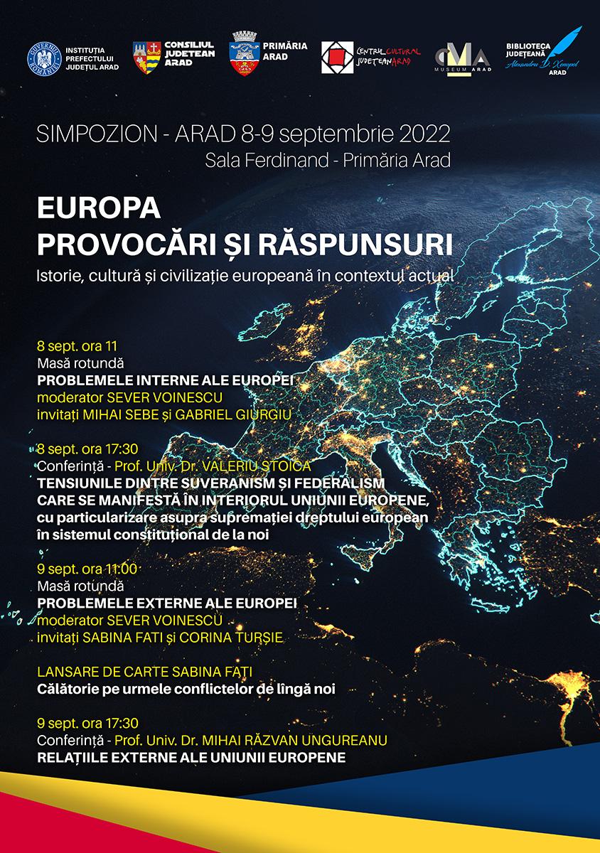 Evenimentul va avea loc în perioada 8-9 septembrie, la Sala „Regele Ferdinand” a Primăriei Municipiului Arad. Programul va debuta joi, 8 septembrie 2022, începând cu orele 11, Sala „Regele Ferdinand”, Primăria Municipiului Arad, va găzdui o primă masă rotundă, axată pe tematica „Problemele interne ale Europei”, moderator va fi Sever Voinescu, iar invitați vor fi Mihai Sebe și Gabriel Giurgiu. Începând cu ora 17:30, Sala „Regele Ferdinand” va găzdui conferința susținută de prof. univ. dr. Valeriu Stoica, cu tema „Tensiunile dintre suveranism și federalism care se manifestă în interiorul Uniunii Europene, cu particularizare asupra supremației dreptului european în sistemul constituțional de la noi”.